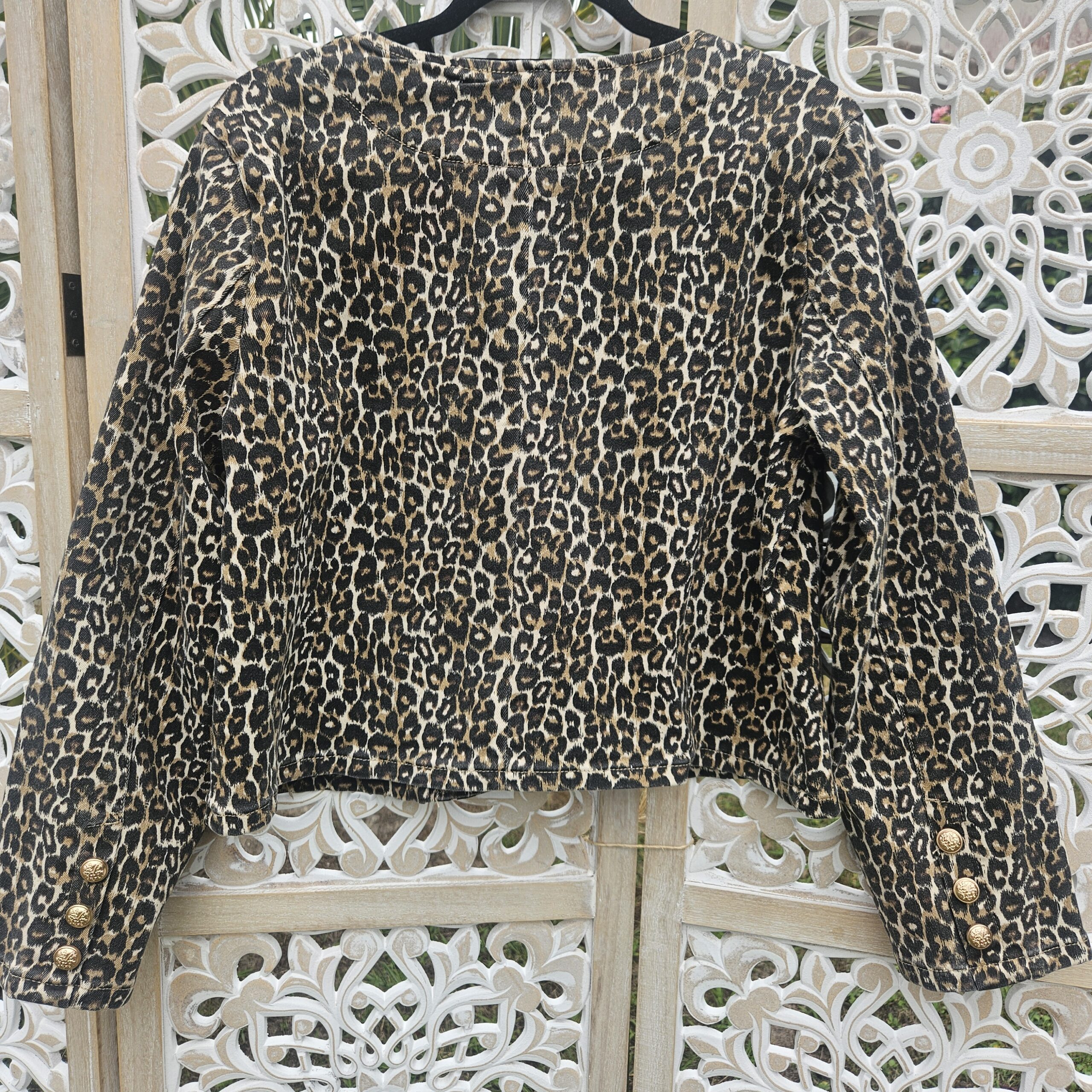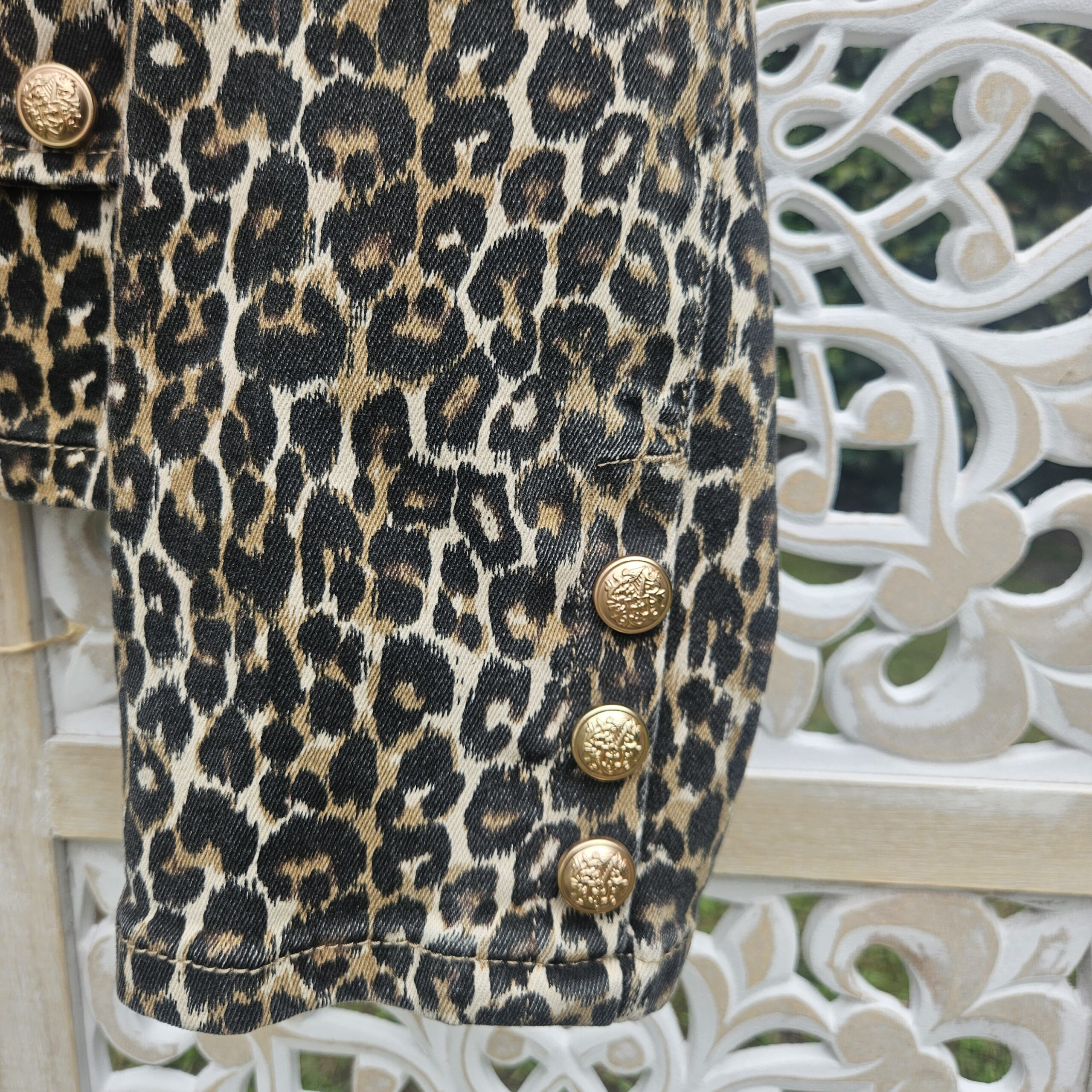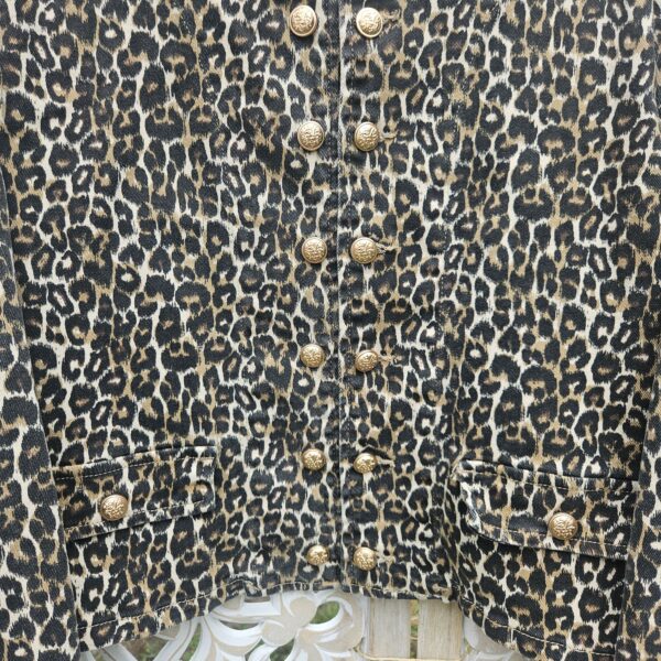 Veste courte en jean’s léopard, cintrée, fermeture par 6 boutons, plus 6 boutons décoratifs, 2 fausses poches, 3 boutons décoratifs aux manches, très agréable à porter, confortable et extensible par la présence d’élasthanne. Se porte cintrée, fermée ou ouverte. Prendre sa taille.