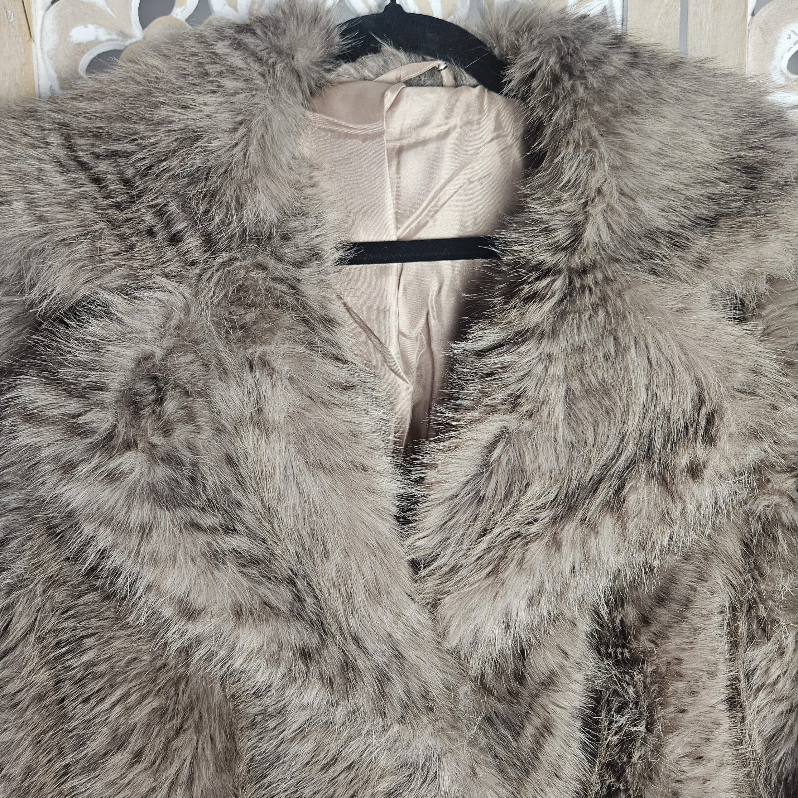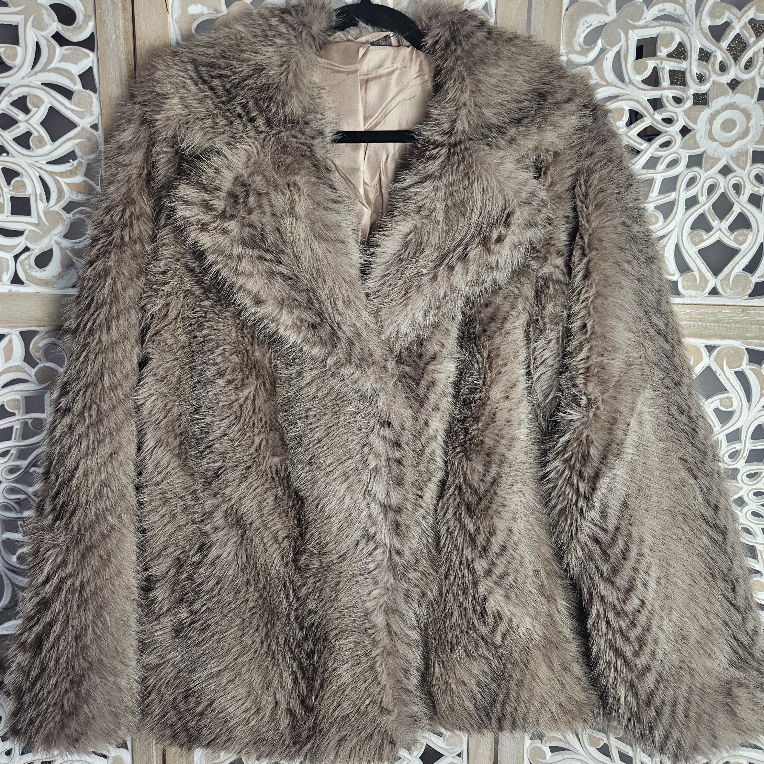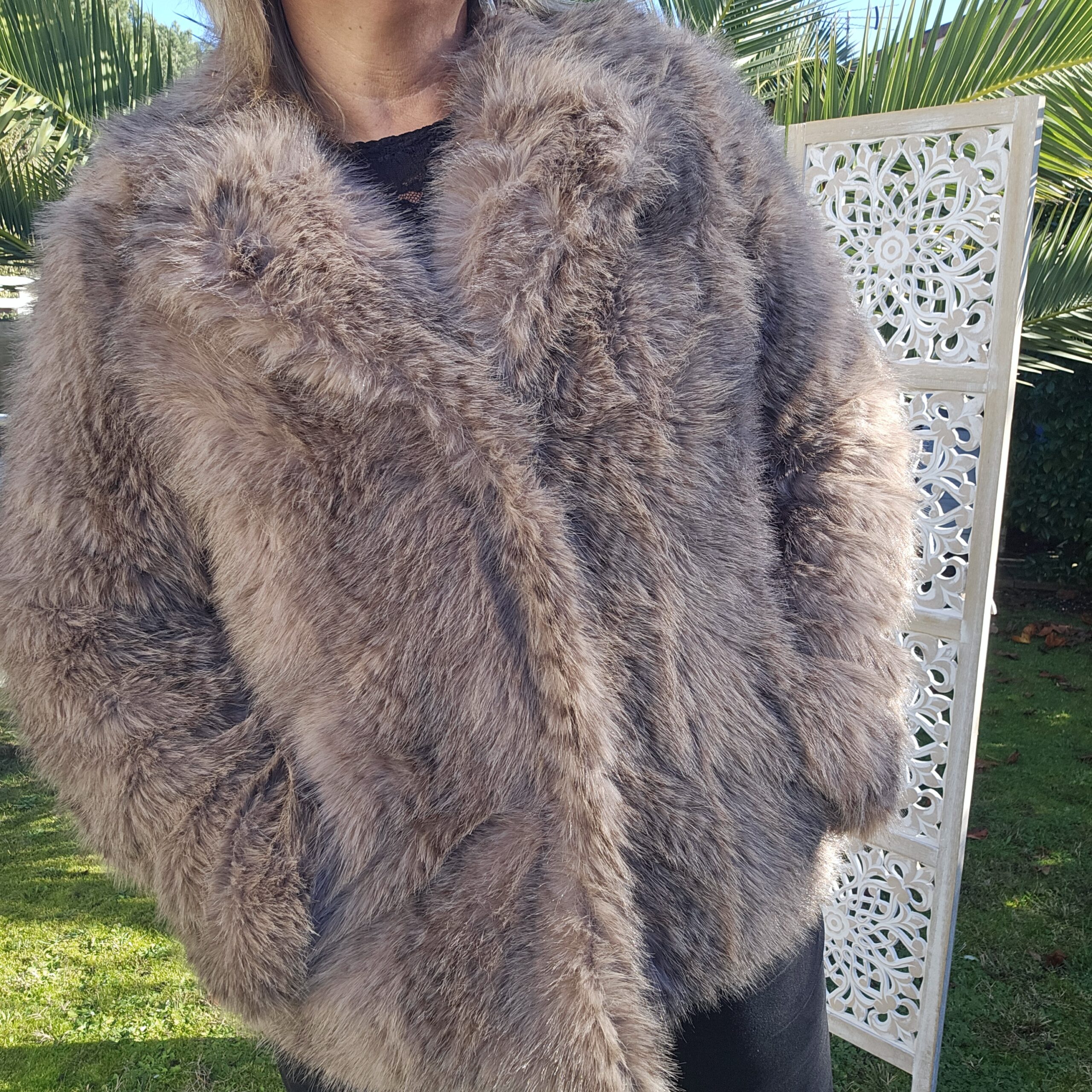 Magnifique veste en fausse fourrure couleur taupe. Fourrure de haute qualité. Col large, 2 poches sur le devant, 2 boutons pressions. Doublée. TU (36/44). Très doux et chaud. Marque Choklate