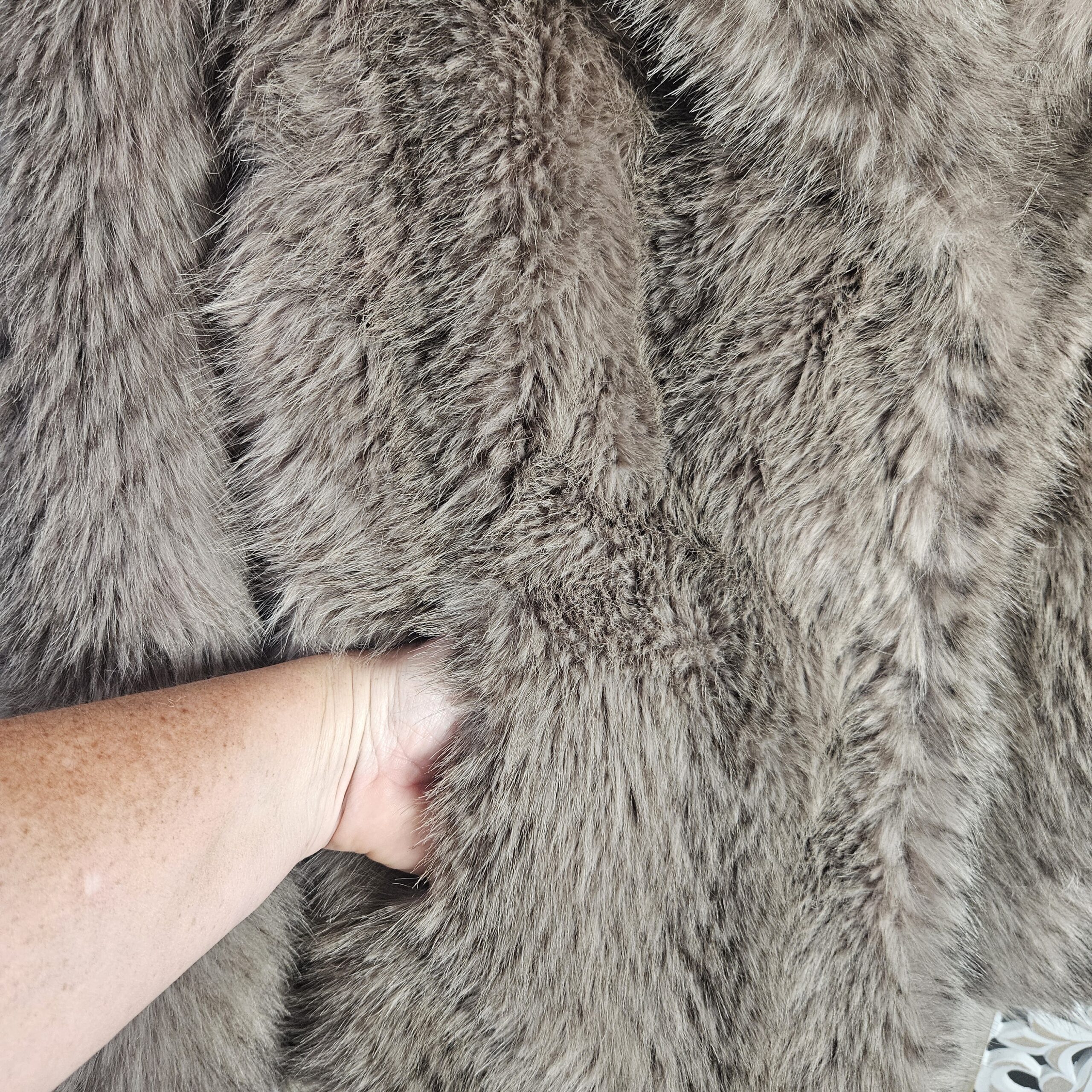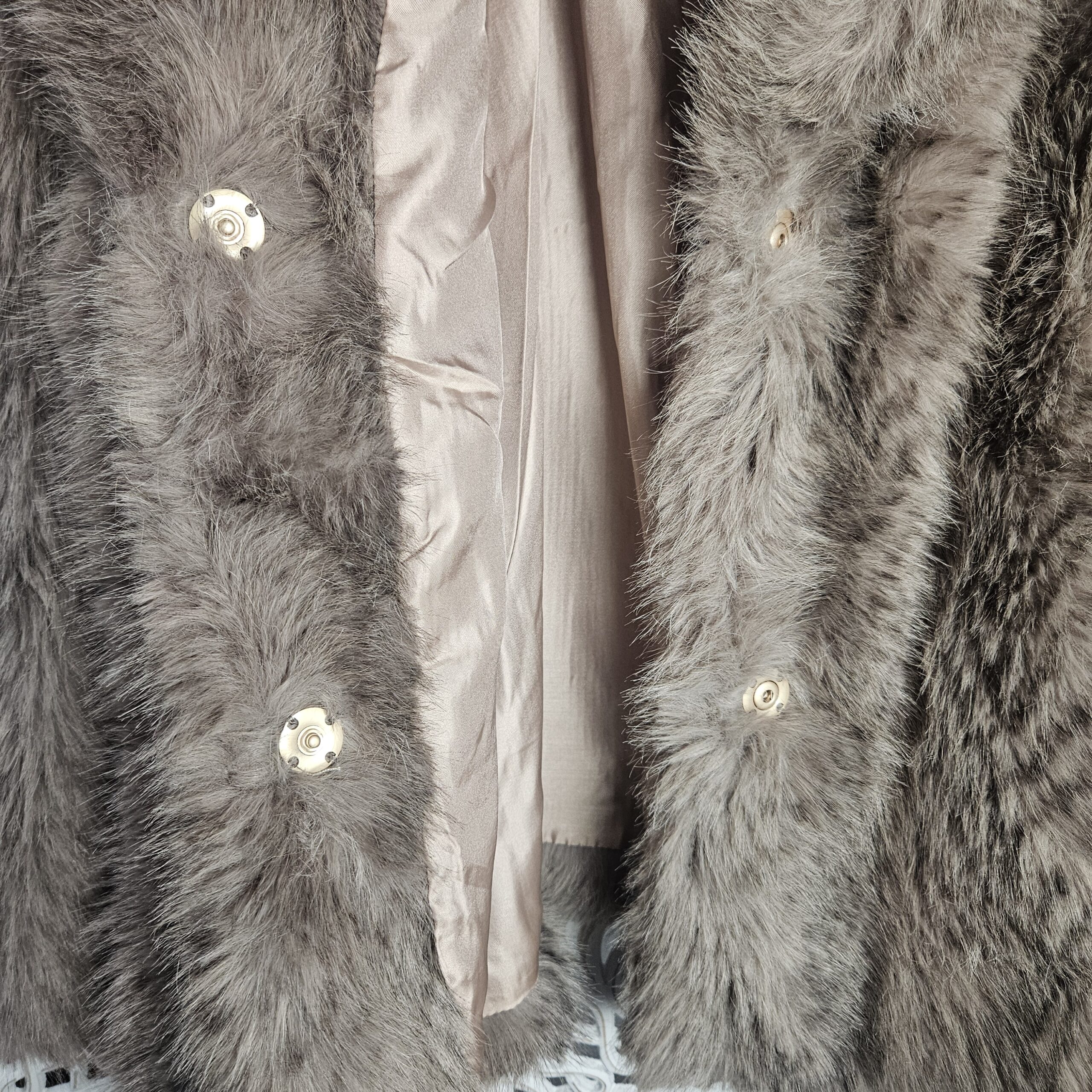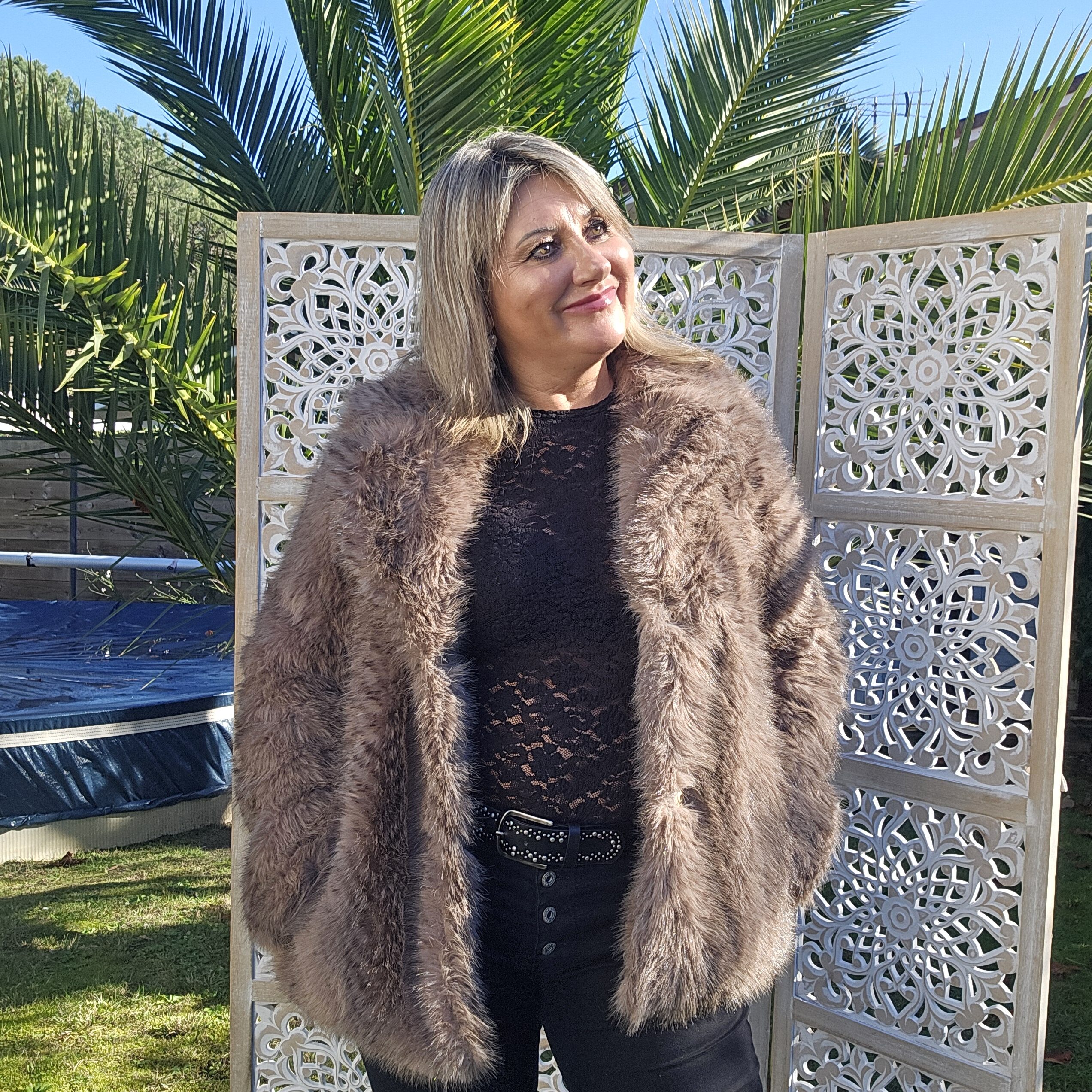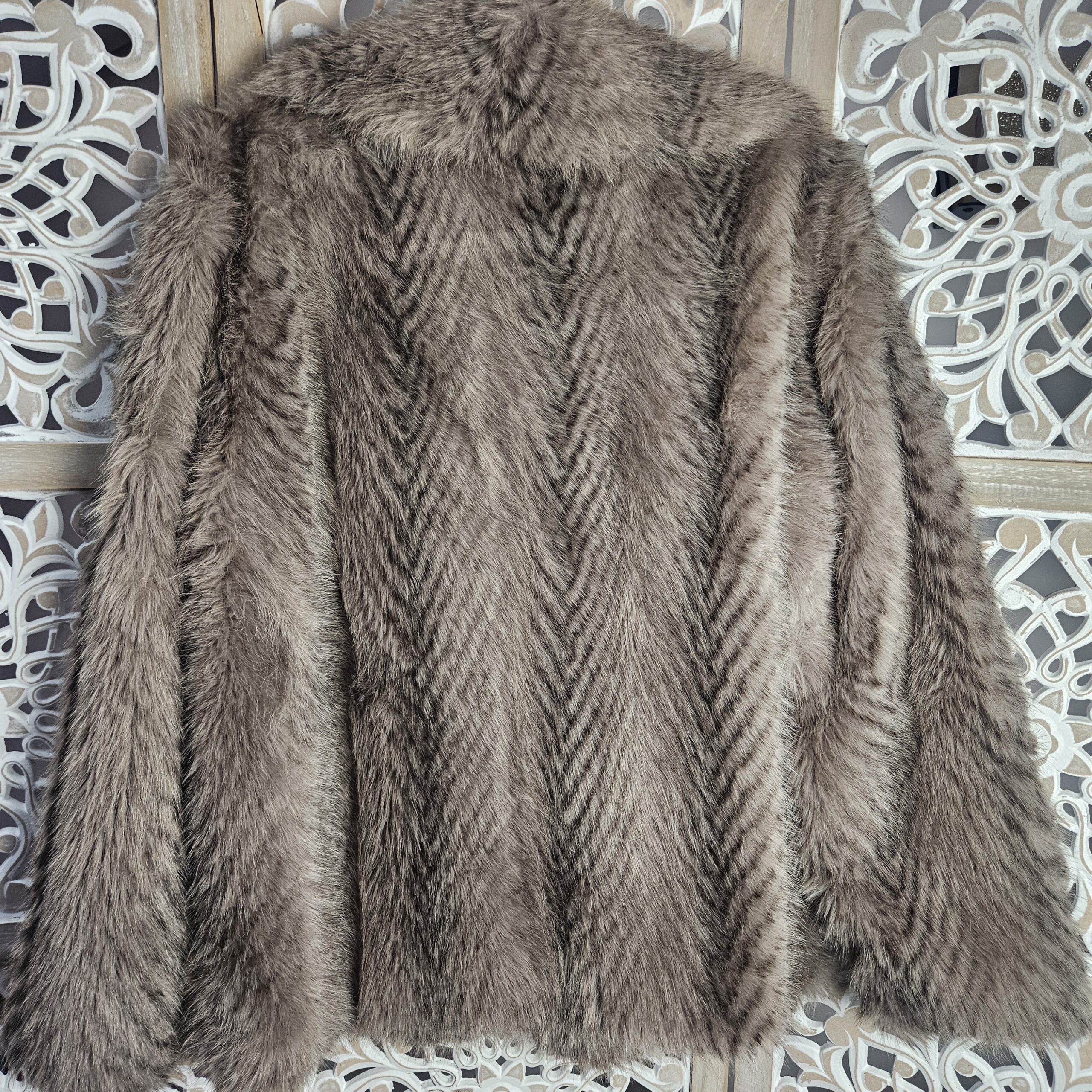 Magnifique veste en fausse fourrure couleur taupe. Fourrure de haute qualité. Col large, 2 poches sur le devant, 2 boutons pressions. Doublée. TU (36/44). Très doux et chaud. Marque Choklate