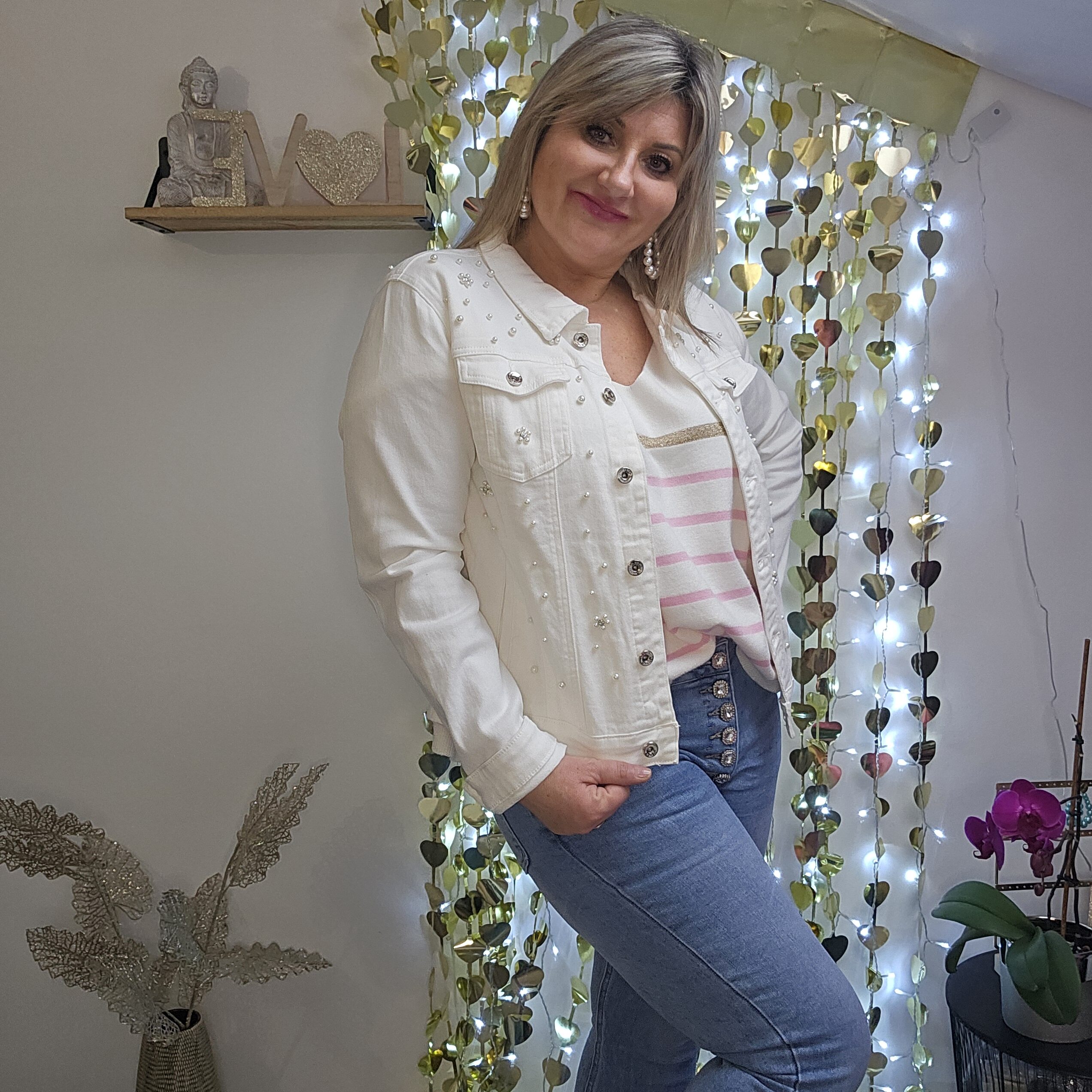 Veste en jean’s blanc cassé, cintrée avec des perles blanches et des brillants, devant et derrière, fermeture par 5 boutons, 2 poches sur la poitrine, 2 poches sur le côté, très agréable à porter, confortable et extensible par la présence d’élasthanne. Se porte cintrée, fermée ou ouverte. Prendre sa taille.